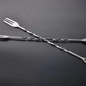 Muỗng khuấy Barspoons được làm bằng chất liệu inox, một đầu có dạng đồng xu nhỏ dùng để khuấy cocktail, đầu kia có thanh nhọn có thể tận dụng để ghim trái cây.